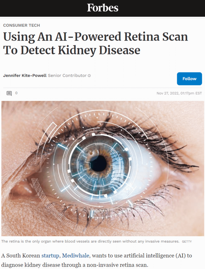 포브스는 ‘망막은 침습적 조치 없이 혈관을 직접 볼 수 있는 유일한 기관이다. 한국의 스타트업인 메디웨일은 인공지능(AI)을 사용하여 비침습 망막 스캔을 통해 신장 질환을 진단하고 있다.’고 소개하면서, 메디웨일 공동 설립자인 최태근 대표의 “혈관 손상과 관련된 질병이 많기 때문에 AI를 활용한 방대한 데이터셋 검증으로 혈관 손상 관련 질환의 조기 징후를 감지할 수 있다”는 발언을 실었다.